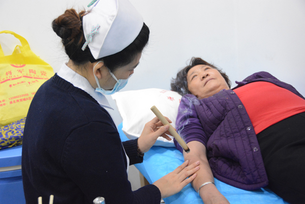 江西热敏灸医院枣庄分院医务人员用热敏灸技术为病人提供服务。